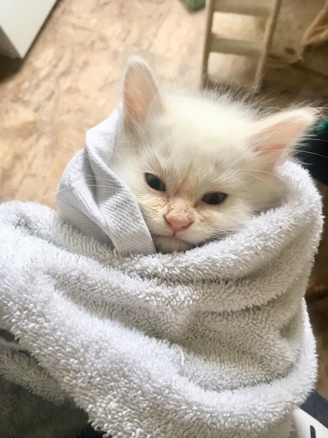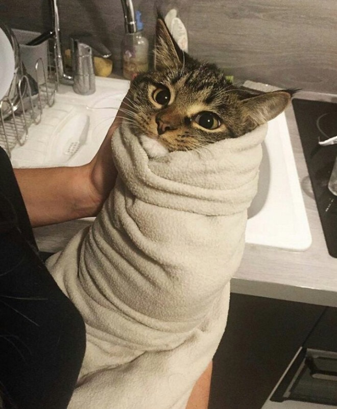 Fürdés után, vagy melegen tartás céljából a takaróba csavart cicák olyan nyugalmat éreznek, mint a bepólyált csecsemők. Ránézésre viszont olyan, mintha szőrős kis burritok lennének, igazán ennivalóak, nézd csak: