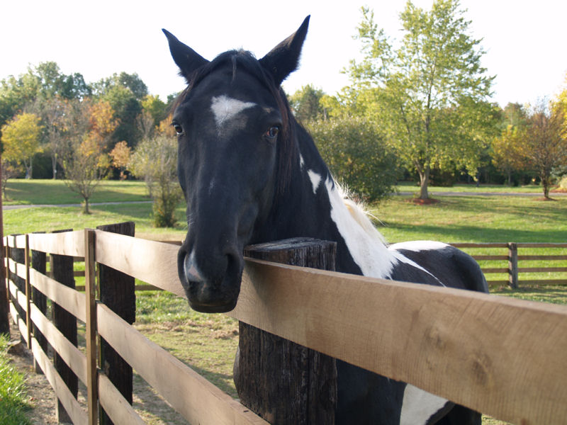 Jó megoldás, hogy ha a karám egy részén a vízszintes karámrudak helyett néhány függőleges hengeres oszlop van olyan messze egymástól, hogy a ló a nyakát ki tudja dugni, de kibújni meg se próbáljon.