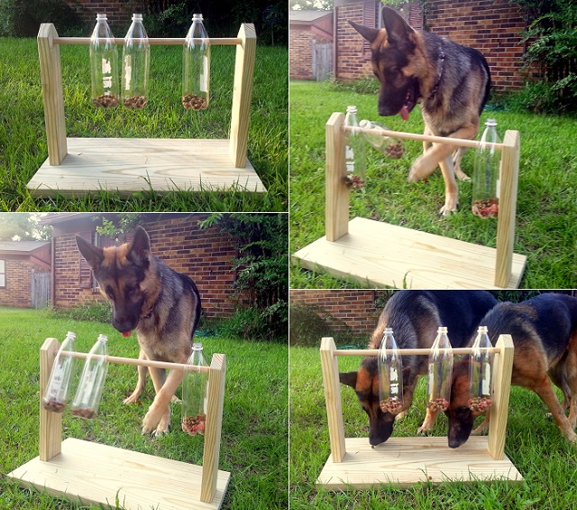 A palackokat a képeken látható módon az oldalukon lyukaszd ki, tegyél beléjük néhány szem kutyaeledelt. Ezt követően fűzd fel őket a rúdra. Majd az egészet helyezd el úgy, hogy a palackok éppen ne érjék el a talajt, könnyen át tudjanak fordulni a rúdon, az egész szerkezet pedig stabilan álljon. Az eredeti kivitelnek egy kis állvány is része, ami egy fordított sámlira emlékeztet, látszólag nagyjából azzal is helyettesíthető.