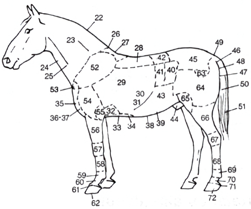 59. csüdízület, 60. csüd, 61. párta, 62. pata, 63. tompor,