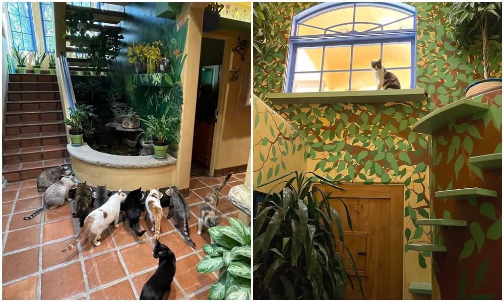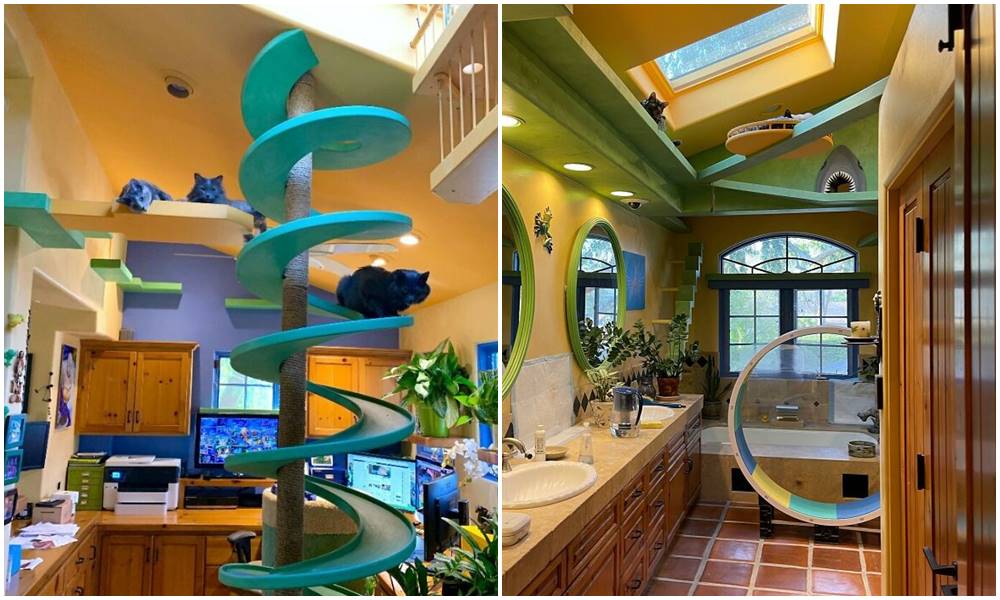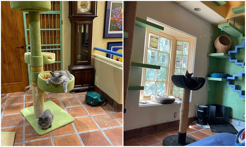 Minden négyzetméter a cicusok iránti rajongásról árulkodik, tele van a ház nekik készült mászókával. Bármikor élvezhetik a magaslati levegőt, és kedvükre kalandozhatnak a falakon.
