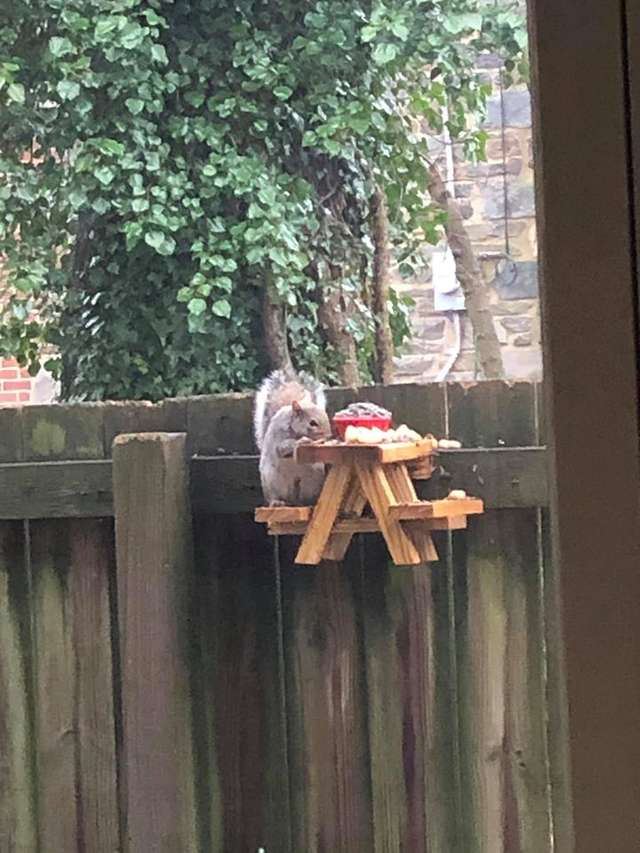 A pennsylvaniai férfi barkácsolt egy picike asztalt padokkal, amit a kerítésére erősített, hogy az ablakából is jól lássa a falatozó kisemlősöket. Az elkészült etetőt mogyoróval töltötte fel, aminek a mókusok látványosan örülnek. Azóta napi kétszer eteti őket.