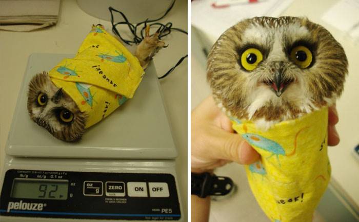 A kevésbé kézhez szokott állatoknál, mint például a baglyok, a betekerés segíthet, hogy mozdulatlanul maradjanak egy pillanatra. Bájos kis tortilla.