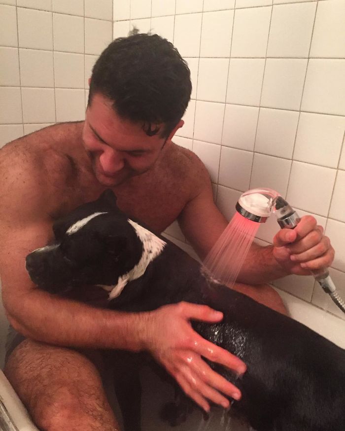 Bizonyára nincs könnyű dolga velük, de látszik, hogy szereti ezt csinálni. A sok munka mellett, sok nevetés és öröm gazdagítja a mindennapjait. Vajon rajta kívül hány férfi ülne be a kádba a kutyájával, hogy megfürdesse?