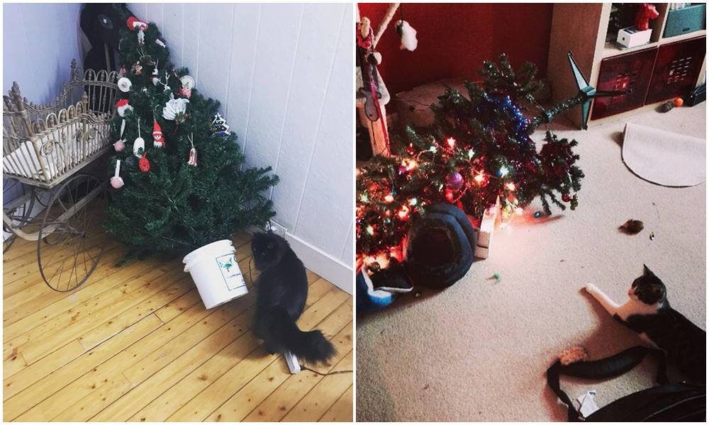 Mivel nem tud mozogni és nem tudja védeni magát, a veszedelmes kismacskákkal szemben esélytelen. Borítékolható, hogy minél szebben sikerül kicsinosítani a fát, annál nagyobb késztetést érez a cica, hogy romba döntse. A fényfüzérek, színes gömbök, girlandok csalogatóak a macskák számára, ezért aki nem tesz óvintézkedéseket, a következőkre számíthat: