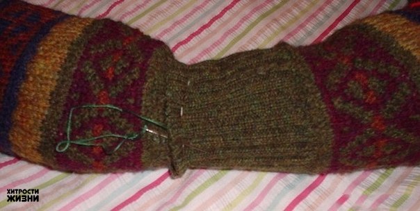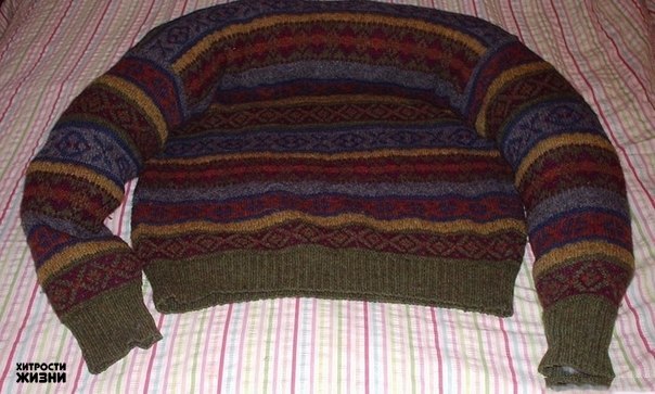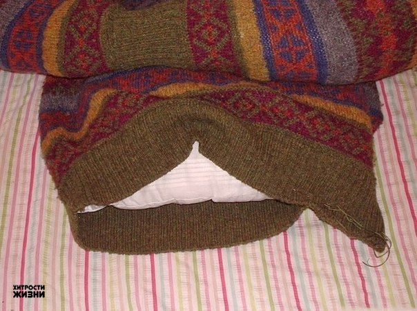 Fordítsuk ki a pulóvert és nyak résznél vágjuk egyenesre és varrjuk végig az egészet!