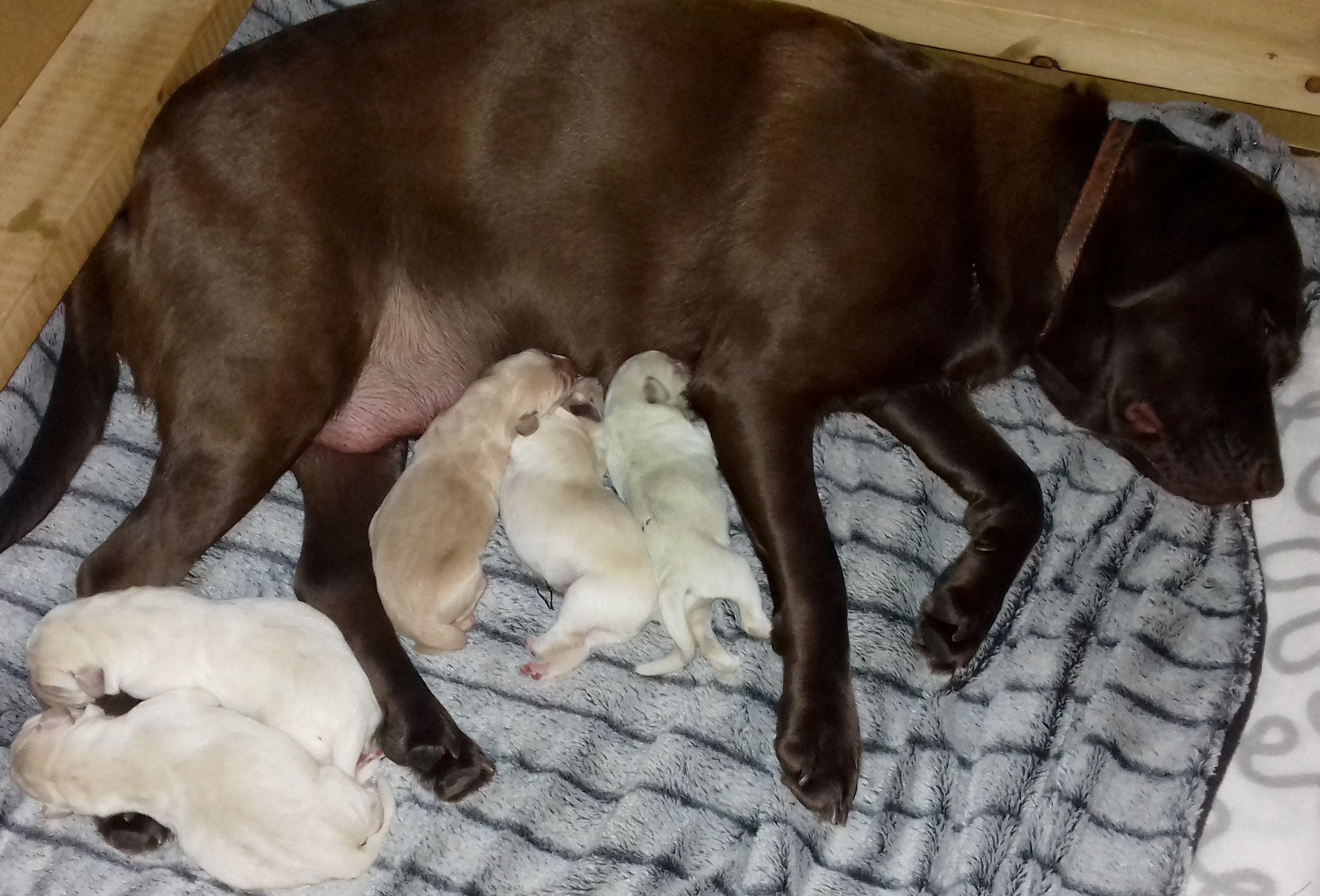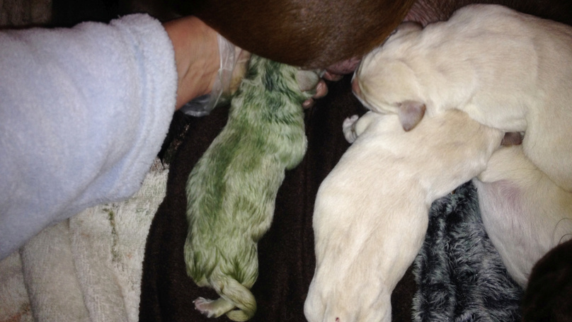Az Angliában élő Elaine és Mark Cooper, igencsak meglepődött, amikor barna labrador kutyájuk Milly, 5 kis kölyöknek adott életét, akik közül az egyik zöld.