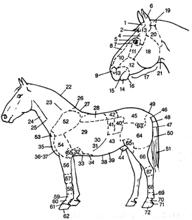 Tehát a fejjel kezdjük, majd a nyak, a hát, az ágyék, a far következik. Ezután a szügy, a mellkas, a has, a nemzőszervek ismertetésére térünk, amelyeket az elülső végtag, a hátulsó végtag részei követnek.