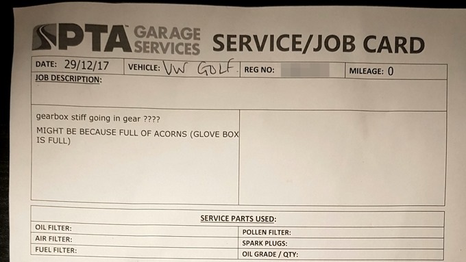 Az autó szervizlapján is ez szerepelt hibaként: „tele makkal (a kesztyűtartó is)”.