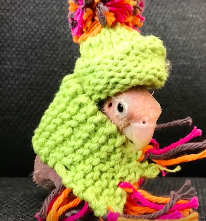 Szegény Rhea, viszont egy vírus következtében teljesen megkopaszodott. A természetben semmi esélye nem lett volna a túlélésre, de szerencsére akadtak megmentői. A szeretetteli gondoskodásnak köszönhetően ma már kiváló egészségnek örvend. Bár a tollai már soha nem nőnek vissza, saját kötött kis ruháiban a pótmamájánál lakva boldogan élheti le az életét.