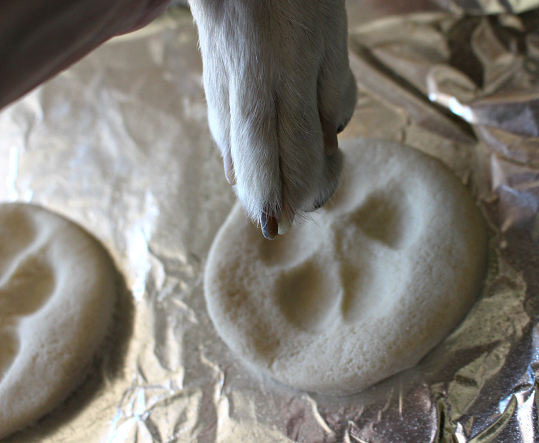 Nyomd bele a kutyapacsit, készíts apró lyukat a tetejére, majd alacsony hőfokra, kb. 90°C-ra előmelegített sütőben szárítsd 2-3 órán át, vagyis egészen addig, míg teljesen megszilárdul.