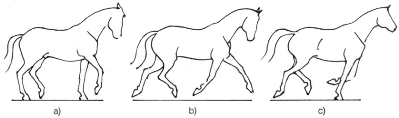 A ló mozgásformái: a) lépés, b) ügetés, c) vágta