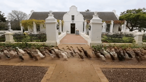 Ezt használja ki a dél-afrikai Vergenoegd borászat is, ahol rengeteg kacsát „alkalmaznak” a szőlő védelmében. Igazi kacsaparédé amikor reggel elindulnak „dolgozni”, azaz a gyümölcsösbe csipegetni.