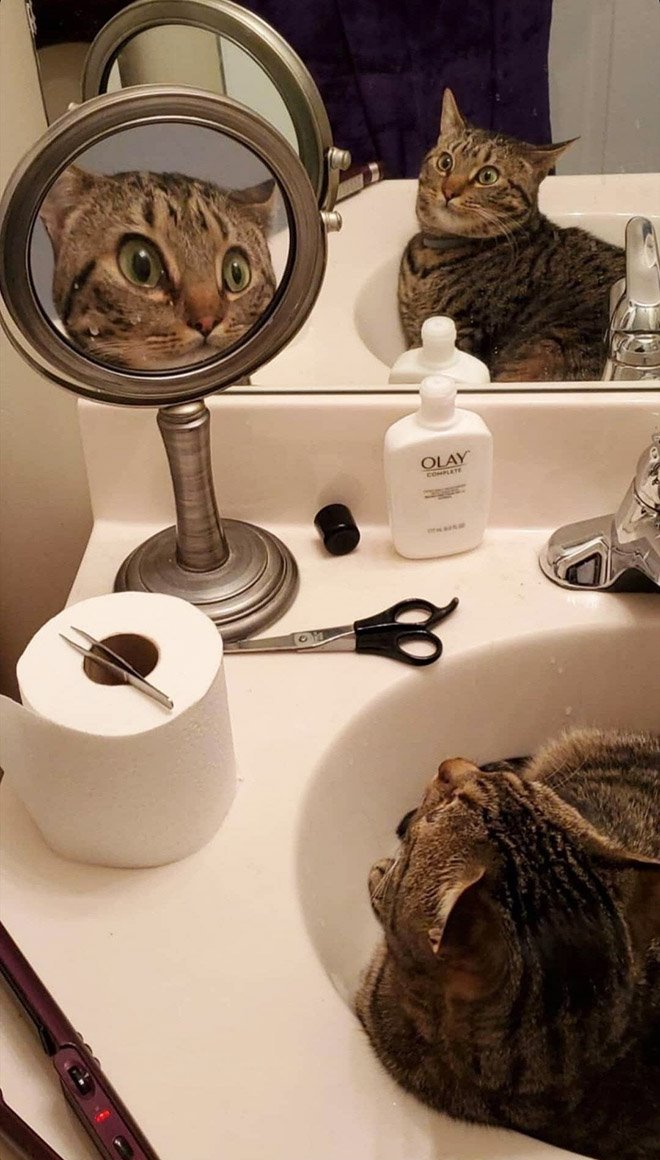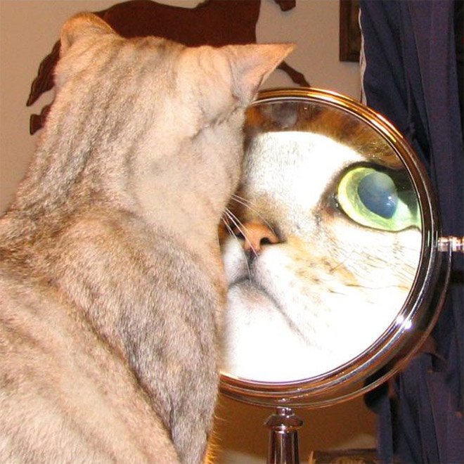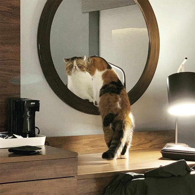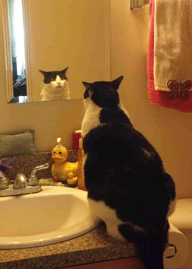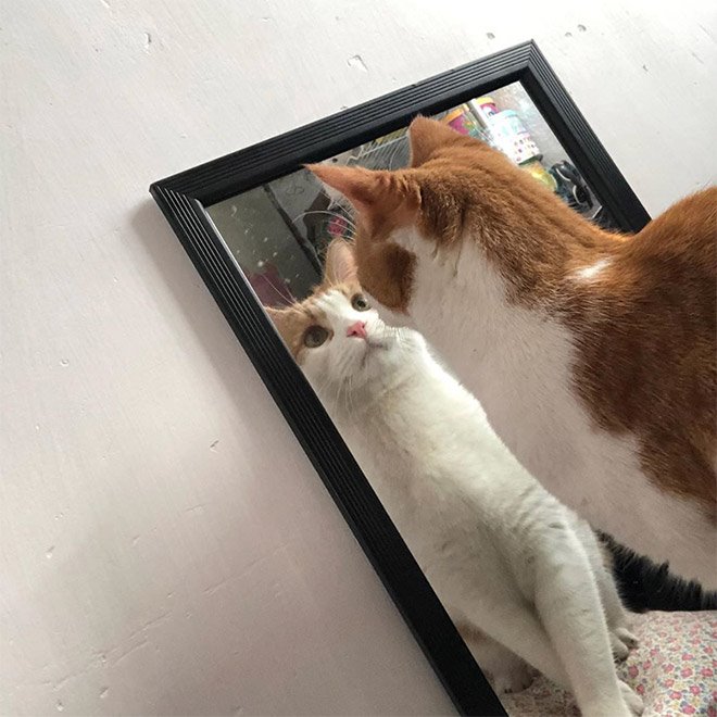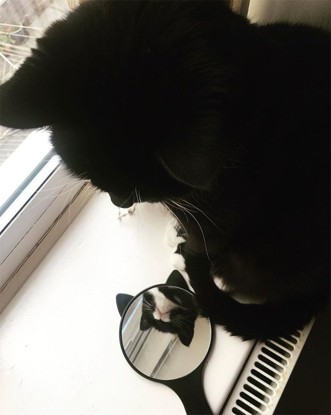 De lehet, hogy nem is tudják, hogy saját magukat látják? Mivel erről nem nyilatkoznak, csak tippelhetünk. Vagy lenyűgözi őket a saját látványuk, vagy azt hiszik, egy másik cicus lapul ott, mindenesetre eléggé leköti őket a tükör. Minket pedig az, ahogy nézzük azt, ahogy nézik magukat: