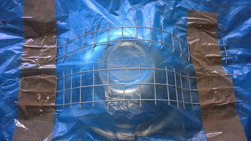 A masszát rásimítottam a formára. A forma két egyszerű, a konyhából hozott fémedényke volt, letakartam szemeteszsákkal és két fémhálót hajtogattam rá – ahogy a képeken látszik is.