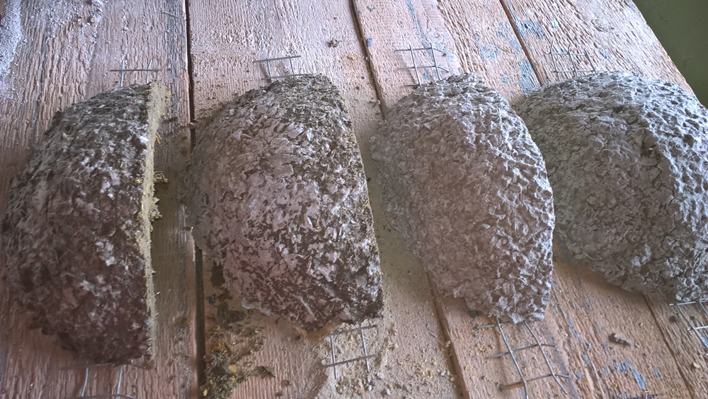 Nálunk egy zsák fűrészpor vagy faforgács 200 forintba kerül, kellett kb. hat maroknyi, tehát mondjuk 30 Ft + a csemperagasztóból szintén, mivel az kültéri, fagyálló és flexibilis, mondjuk 200 forint. A fémháló 1200 Ft/nm, így az sem került 100 Ft-nál többe. Tehát összesen 330-350 Ft- ból lett 4 fészek.