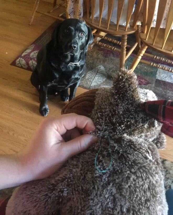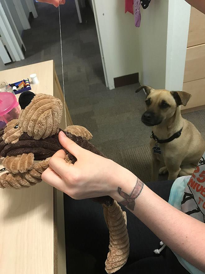 A plüssök nem sokáig szokták bírni szakadás nélkül, de megvan az az előnyük, hogy egyszerűen és könnyen javíthatók, megvarrhatók. Amíg ez megtörténik, a legtöbb kutyus óvó szemekkel figyeli a műveletet, türelmetlenül várja a „műtét” végét. Idő kérdése, hogy újra visszakapják őket megjavítja, addig viszont aggódó tekintetük le sem veszik róluk: