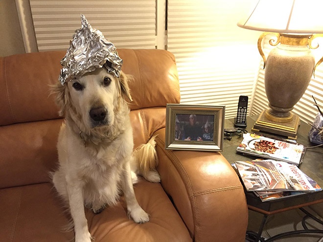 Sokan hisznek a különböző összeesküvés elméletekben és abban, hogy vannak, akik olvasni tudnak az elménkben. Erre nyújt segítséget az alufólia sapka, ami bizonyára a kedvencünket is megvédi ezektől a dolgoktól. Nem fogják az ufók tudni, hogy mi jár a fejükben. Ha a gazdinak segít, akkor nyilván a kutyáknak, macskáknak is. Vagy mégsem?