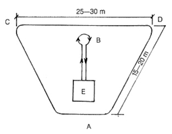 Ha bizottsági bírálatról van szó, akkor felvezető-, bírálóhelyet kell kialakítani az ábrának megfelelően. (Az itt bemutatott felvezetőhelyet utánozza az egyszeri megítélés helye, csak egyszerűbb körülmények mellett.) A felvezetőhely méreteit az ábra mutatja.