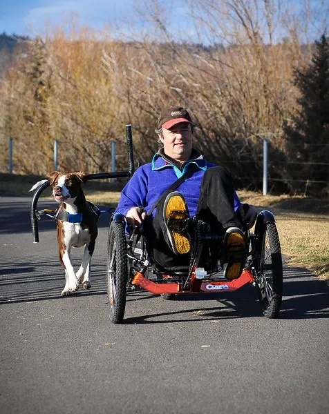 A szerkezet, ami egy rollerhez hasonlít, de kutya hajtja, garantálja az eb biztonságos lemozgatását.