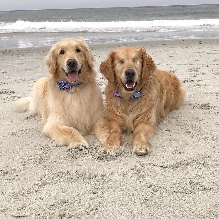 Az, hogy csak az egyikőjük lát, nem akadályozza őket semmiben, boldog és kiegyensúlyozott kutyusok. A képek önmagukért beszélnek: