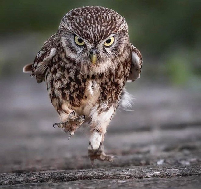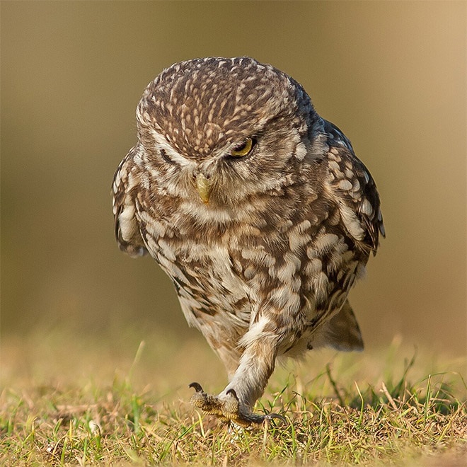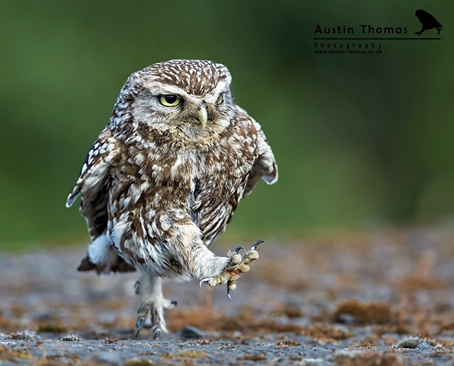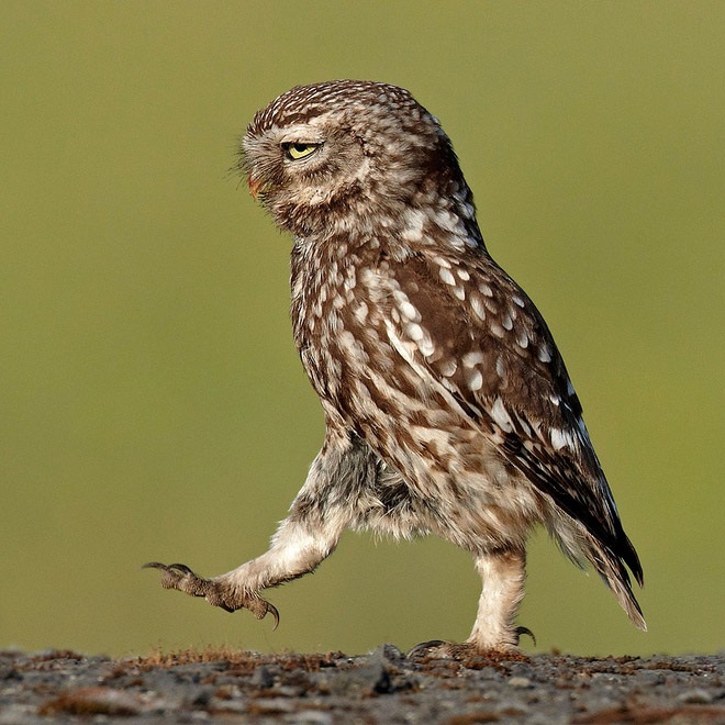 Természetes közegükben a baglyokat leginkább vagy egy fix ponton feszült figyelemmel nézelődve láthatjuk, vagy röptében. Austin Thomas viszont rendszeresen kapja lencsevégre a harmadik variációt, amikor épp sétálnak. A rosszalló külsejük mellé ez a katonásnak tűnő járás csak hab a tortán, nézd csak: