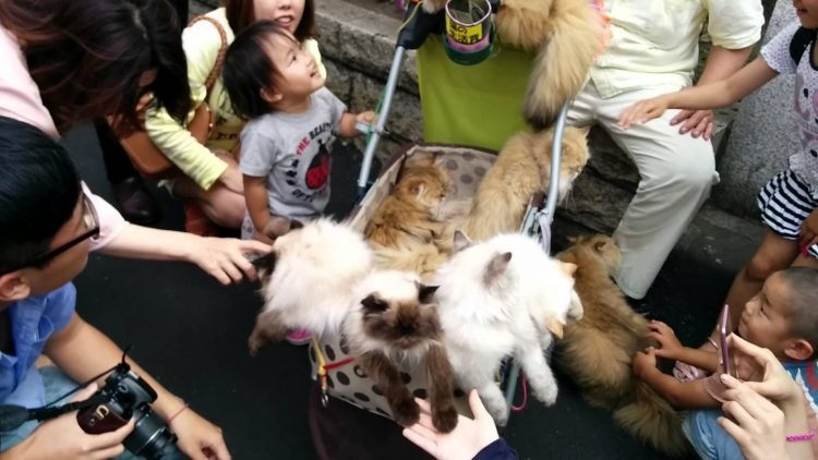 Masahiko Suga a 9 macskáját babakocsival sétáltatja az utcán. A ‘Cat Man’ becenévre keresztelt 55 éves nyugdíjas nem éppen megszokott módját választotta kedvencei sétáltatására.