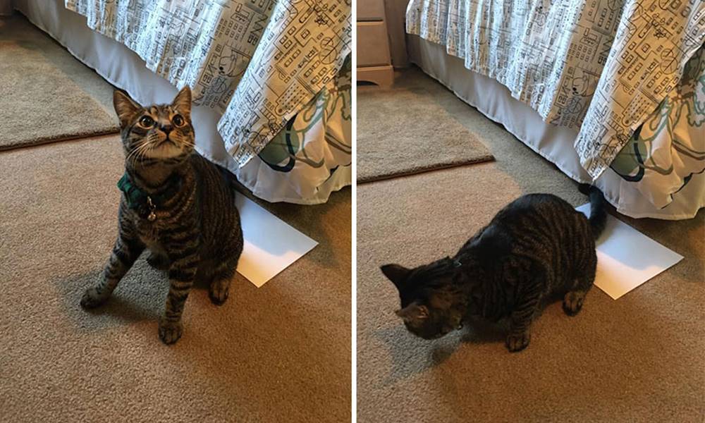 Ahhoz, hogy a kérdést meg lehessen válaszolni, egészségre ártalmatlan rúzst használt festékanyagnak, amivel a cicák fenekét kente be. Így közlekedtek az állatok a lakásban és ültek, álltak, feküdtek a bútorokra, épp úgy, mint egyébként szoktak a hétköznapok során. A letett fehér papírokon kellett volna nyomot hagyniuk, ha a fenekük ténylegesen érinti a felületeket.