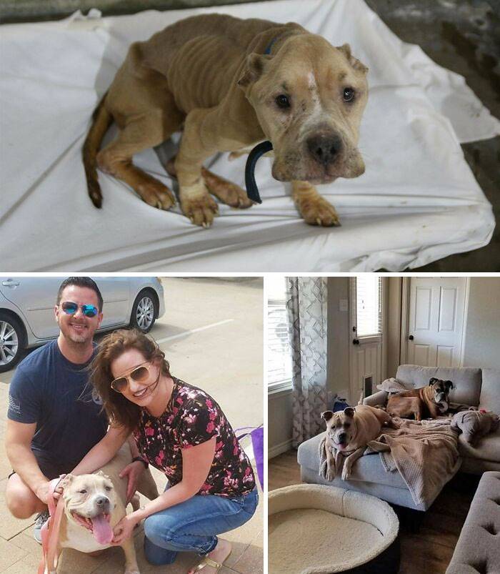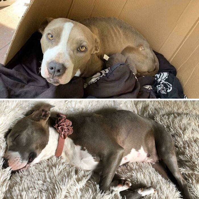 A reszkető, sovány kölyökkutyát befogadta egy pár. Azóta egy termetes pitbull lett, aki szeret ágyban aludni és imádja a családját.