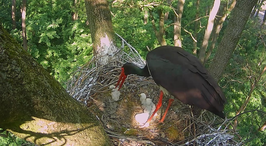 A másik 3 fekete gólya szépen növekedett tovább a fészekben. Már hasonlítanak szüleikre azzal a különbséggel, hogy még sárga a csőrük. Hosszas szárnybontogatásuk után a legbátrabb július 10-én kirepült a fészekből. Egy másik fán egyensúlyozott egy darabig, aztán visszatért otthonába. Két testvére is szorgosan gyakorol, valószínű hamarosan ők is kipróbálják a repülést. Szüleik egyre ritkábban etetik őket, lassan az önállóság mezejére lépnek.