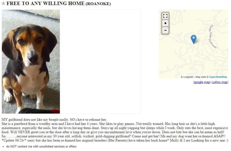 „A barátnőm nem szereti a kutyámat Molly-t, így új otthont kell találnom neki. Fajtiszta, jó helyről származik, és négy évet töltöttünk együtt. Szeret játszani, de nem igazán képzett. Hosszú szőrű, így az átlagosnál több törődést igényel, különös tekintettel a körmeire. De ő nagyon szereti, ha törődnek vele. Nem alszik sokat és rengeteg zajt csap egész éjjel; helyette akkor alszik, amikor én dolgozom. Csak a legjobb és legdrágább ételeket hajlandó megenni. SOHA nem üdvözöl az ajtóban amikor hazaérek a munkából egy hosszú nap után, és soha nem ad feltétel nélküli szeretetet még akkor sem, ha magam alatt vagyok. Nem harap, de pokollá tudja tenni az életed.