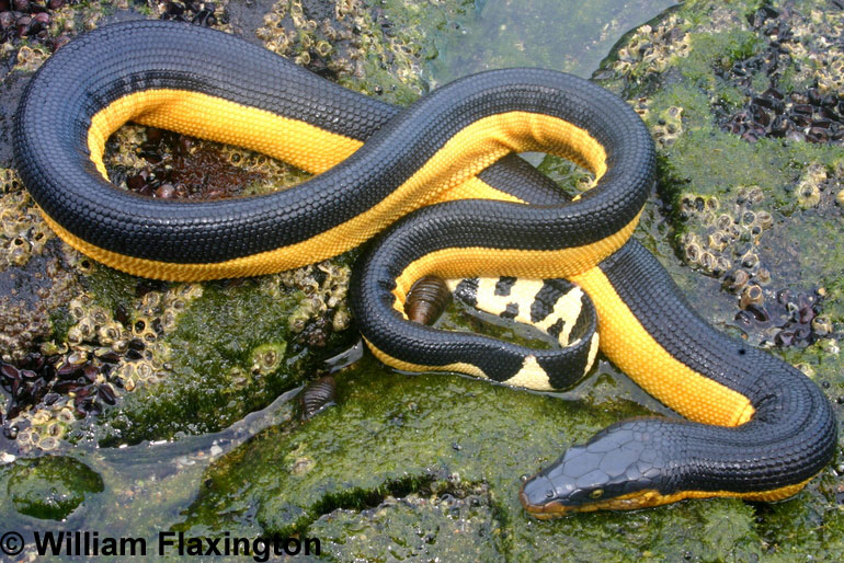 A legmérgesebb kígyók a tengerben élők csúszómászók. Ők kisebb változatosságot mutatnak, hiszen táplálékuk nagyon hasonló: a hekk! Vagy valami más halacska. Így nem volt szükségük arra, hogy méregpalettájukon megjelenjenek extrás változatok is. A vízben élő kígyók alkata is teljesen különbözik szárazföldi rokonaikétól. Egy irányban kissé lapított testük a gyors és pontos lábtempóhoz – izé: úszótechnikához – idomult. Nincs kopoltyújuk, vagyis rendszeresen fel kell jönniük a felszínre levegőért. A kettősszínű tengeri kígyó (Pelamis platurus) például az egyik legmérgesebb kígyóféle, akivel nem érdemes szembetalálkozni a vízben. Ugyanis amellett, hogy egy csepp mérgével 2-3 embert is kinyírhat, még igen agresszív is. De a kígyószakik azt mondják, nem kell félni: csak akkor támad, amikor éhes. És amikor rossza hangulatban van. Viszont akkor gyorsan és biztosan, egyetlen méregkomponenssel mindent visz. Kösssz.