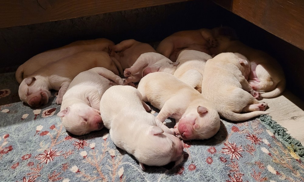 Zina 24 órás ügyeletet tart az első hónapban, de akkor azonnal elalszik, amikor szopnak. Csupán napi egy-másfél órára jön ki a kiskutyái mellől, általában háromszor. 10 perc alatt eszik, elvégzi a dolgát, majd visszamegy és odafekszik az ellető láda mellé. Van, amikor ennyi pihenés sem jön össze, mert annyira nyüzsögnek a kicsik, hogy azonnal bemegy hozzájuk.