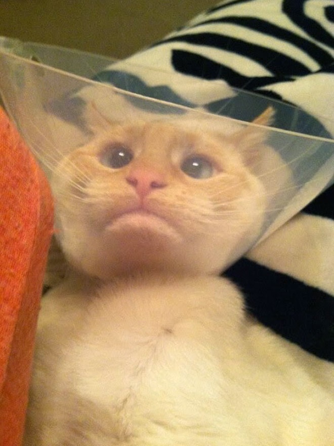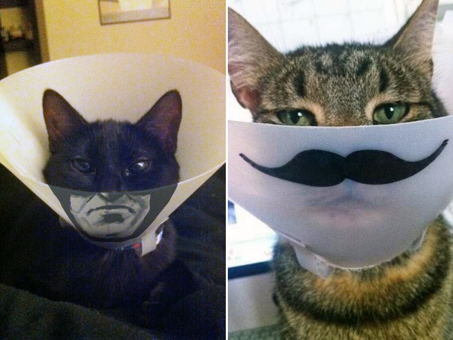Az első pillanatban ez nagyon zavaró számukra, később kicsit beletörődnek, de a seb gyógyulása után le is kerül róluk a kényelmetlen eszköz. Addig viszont kellemetlen és mókás pillanatoknak lehetünk tanúi.